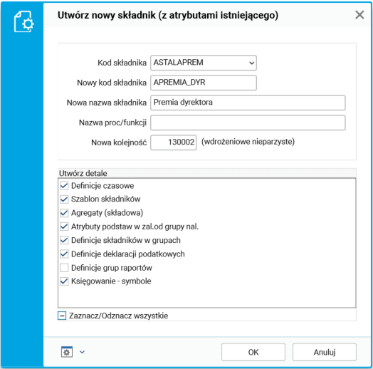 - Utwórz nowy składnik (z atrybutami istniejącego) w słowniku Definicje składników płacowych,