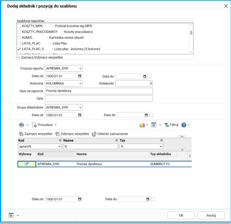 Pozycja raportu pozwala wybrać z listy rozwijanej kod składnika (w opisywanym przypadku jest to APREMIA_DYR).
