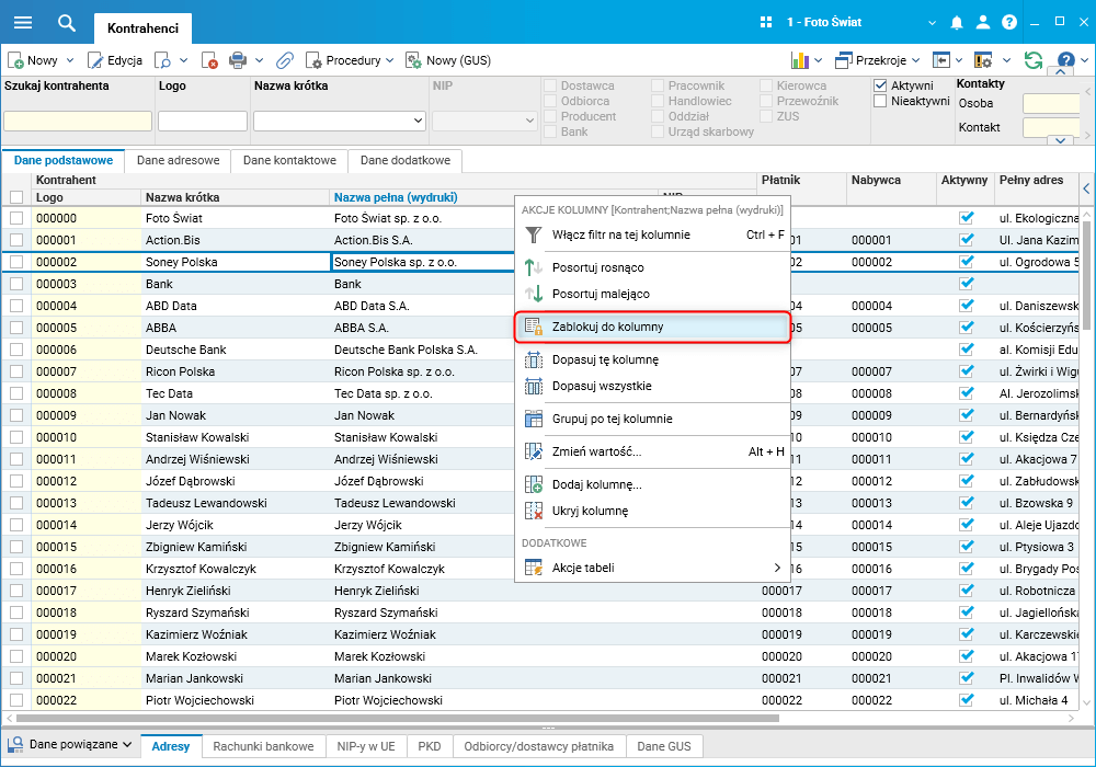 Umożliwiono zablokowanie kolumn w tabeli tak jak w arkuszu kalkulacyjnym Excel. Zablokowane kolumny widoczne są przez cały czas podczas przewijania widoku tabeli w prawą stronę.