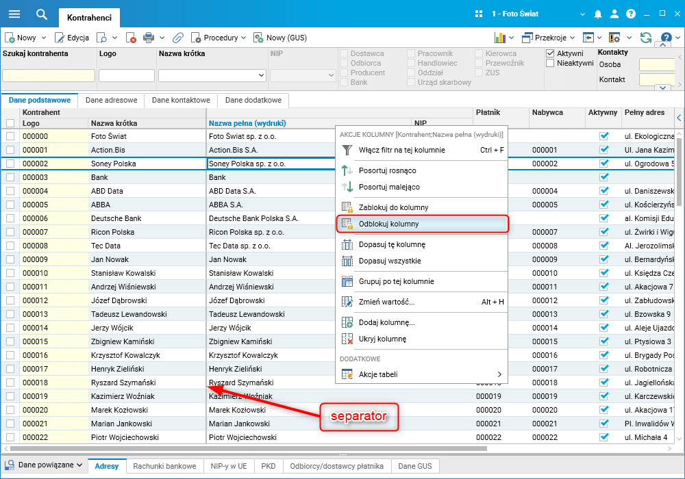 Do akcji kolumn dodano Zablokuj do kolumny. Za kolumną, na której użyto tej akcji, pojawia się separator. Wszystkie kolumny znajdujące się po lewej stronie separatora zostaną zablokowane i pozostaną widoczne podczas przewijania. Użytkownik może dostosować liczbę zablokowanych kolumn, przeciągając separator. Funkcjonalność włączamy akcją Zablokuj do kolumny, a wyłączamy akcją Odblokuj kolumny.