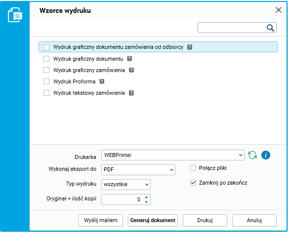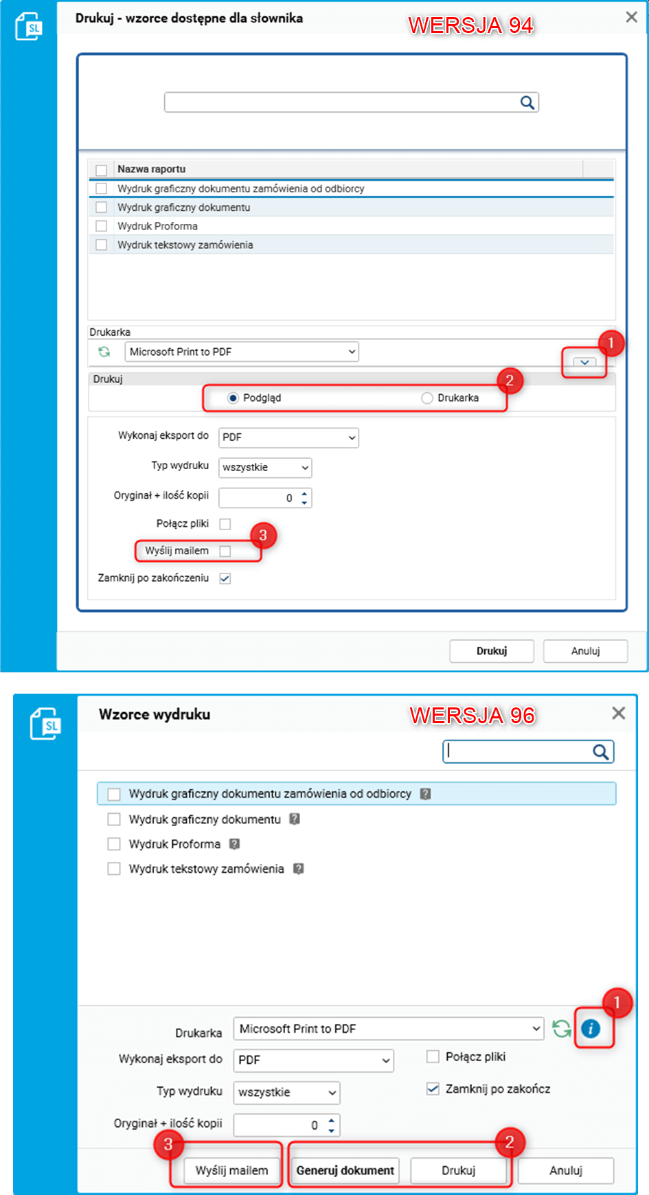 · W poprzedniej wersji, aby określić, czy chcemy przesłać wydruk bezpośrednio na drukarkę, czy też wygenerować dokument do podglądu, należało najpierw zaznaczyć odpowiednią opcję (2). W nowej wersji, używając odpowiednich przycisków, możemy w szybszy sposób zdecydować, co chcemy zrobić. Przycisk Generuj dokument oznacza wygenerowanie raportu z podglądem, a przycisk Drukuj przesyła raport na wybraną drukarkę.