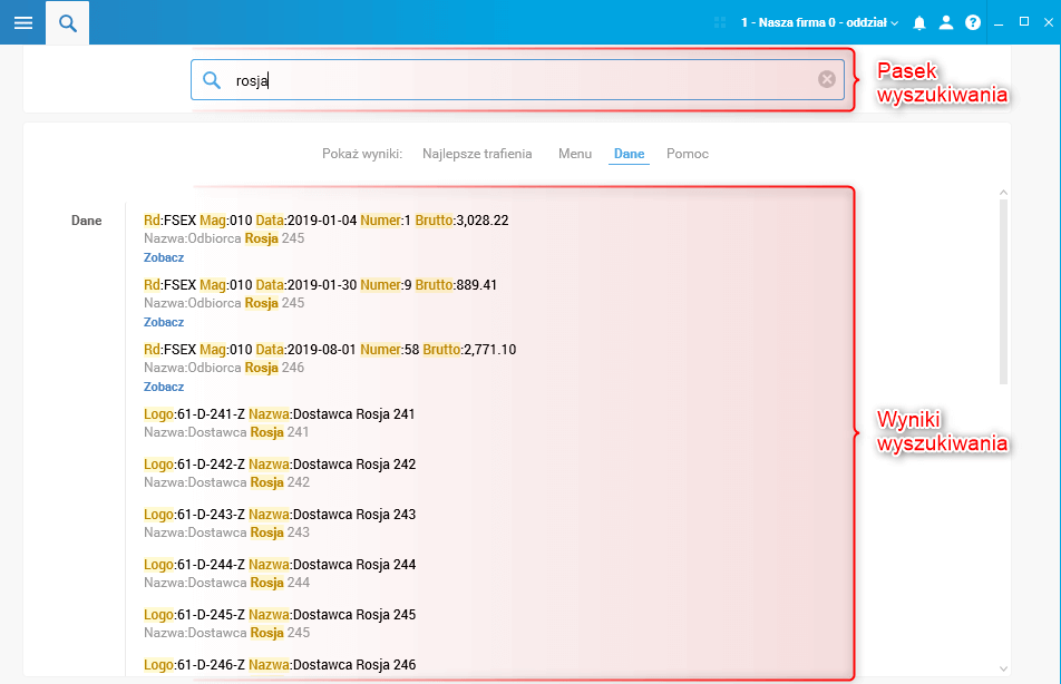 · Pierwszy wiersz – opisuje znalezione dane (w przykładzie powyżej są to dokumenty modułu FK identyfikowane przez Rd, Mag, Data, Numer oraz kwotę Brutto, a także rekordy ze słownika kontrahentów identyfikowane przez Logo i Nazwę). Kliknięcie w pierwszy wiersz przenosi nas do odpowiedniego słownika z maskami ustawionymi tak, aby pokazać znaleziony rekord.