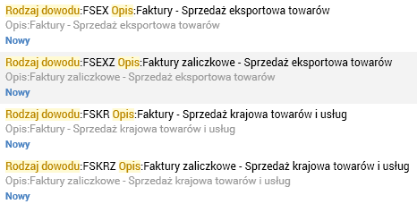 · Trzeci wiersz (opcjonalny) – zawiera dodatkowe akcje skojarzone ze znalezionymi danymi (w przykładzie powyżej akcja Zobacz otworzy nam formatkę edycyjną dokumentu modułu FK, w przykładzie poniżej akcja Nowy umożliwi nam wprowadzenie dokumentu FK o danym rodzaju dowodu – wyszukiwano słowo „sprzedaż”).