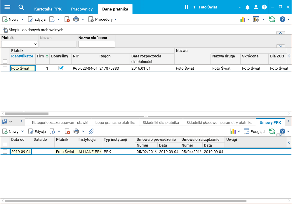 Umowy o zarządzanie i prowadzenie PPK rejestruje się w szczególe Umowy PPK w słowniku Dane płatnika.