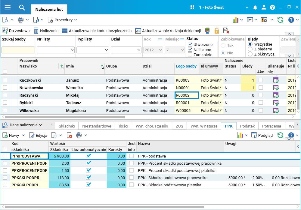 Naliczone składki na PPK są widoczne w szczególe PPK w słowniku Naliczenia list.