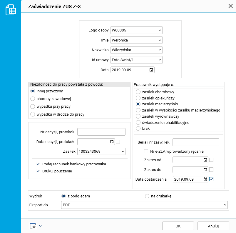 Rys. Parametry zaświadczenia ZUS Z-3