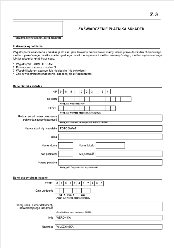 Rys. Zaświadczenie ZUS Z-3, str.1