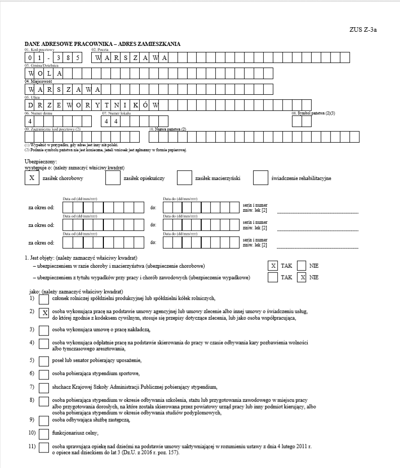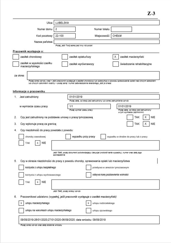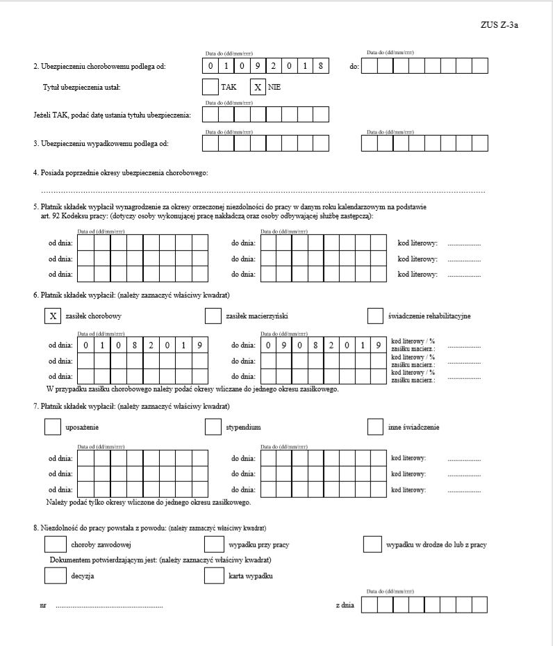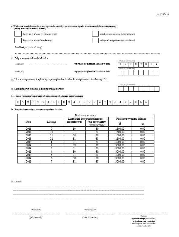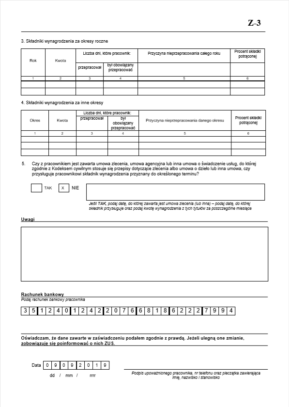 Parametry wniosku ZUS Z-3a