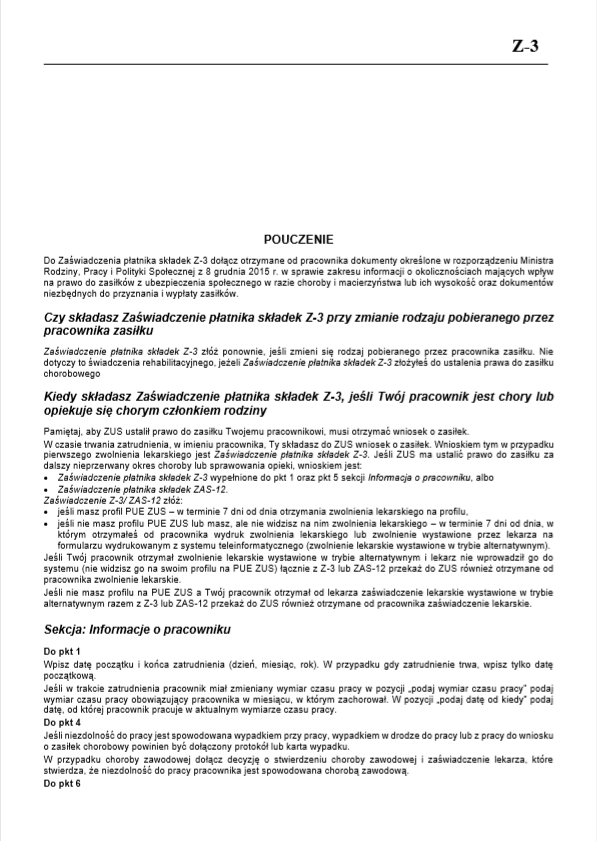 Rys. Zaświadczenie ZUS Z-3, pouczenie str.1