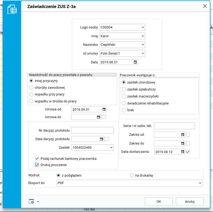Rys. Parametry zaświadczenia ZUS Z-3a