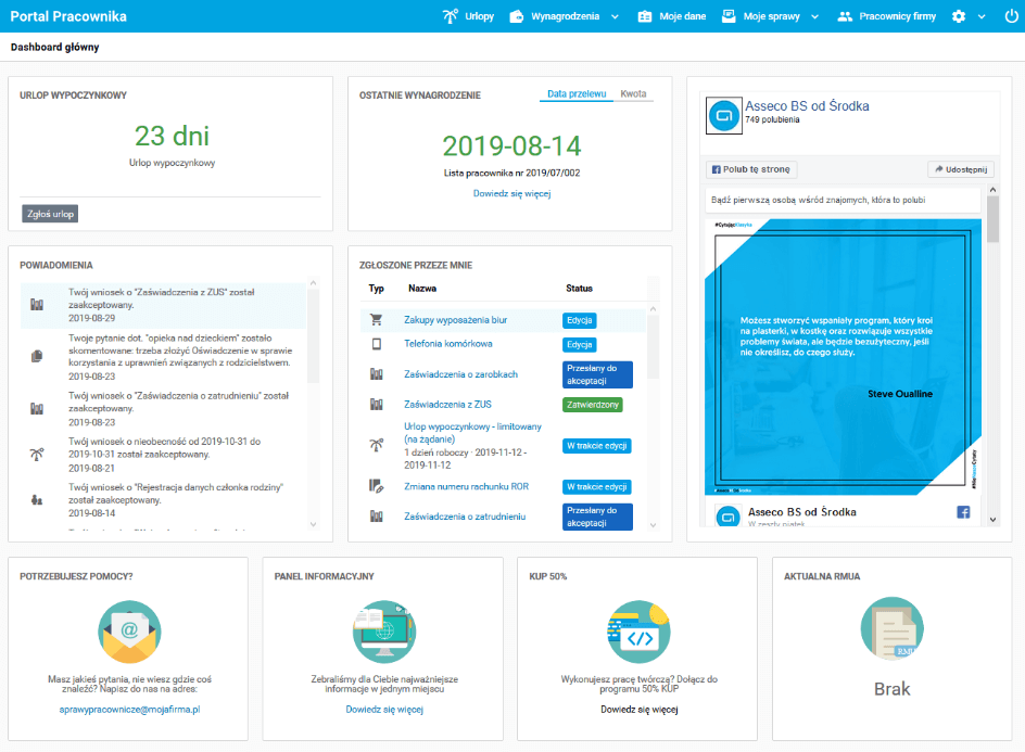 Poniżej przedstawiony został dashboard główny Portalu Pracownika: