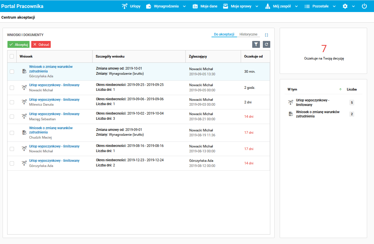Dla przełożonego został utworzony dashboard Centrum akceptacji.