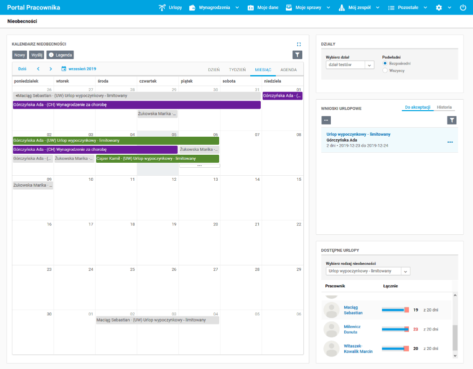 Słownik Urlopy i nieobecności został zastąpiony przez dashboard Nieobecności, dostępny w obszarze funkcjonalnym Mój zespół. Pokazuje on nieobecności (urlopy, zwolnienia i inne) wszystkich członków zespołu przełożonego. Na wspólnym kalendarzu prezentuje absencje całego zespołu.