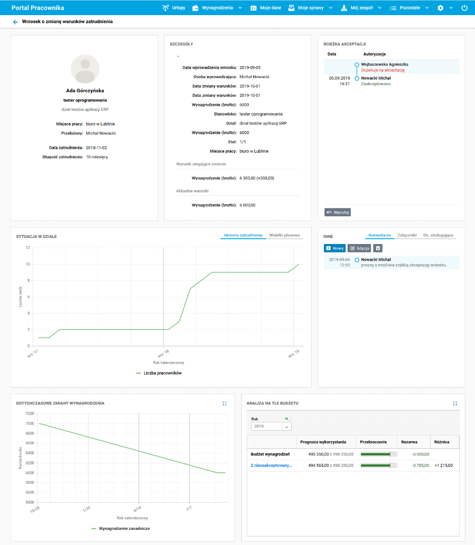 Dashboardy obsługujące wnioski kadrowe składane przez przełożonego zostały rozszerzone o sekcje zawierające informacje o sytuacji kadrowej w dziale oraz zaplanowanym budżecie. Umożliwiają one analizę aktualnych warunków wynagrodzenia pracowników na tle budżetu wynagrodzeń i sytuacji w dziale (m.in. historii zmian zatrudnienia oraz widełek płacowych na poszczególnych stanowiskach).