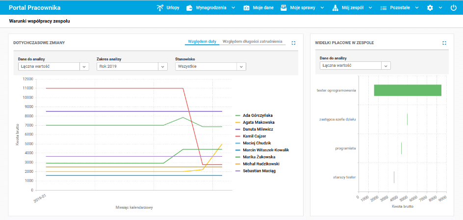Sekcja Dotychczasowe zmiany w tym dashboardzie pokazuje przełożonemu w formie wykresu, jak zmienia się wynagrodzenie pracowników – członków jego zespołu, zarówno kwota ogółem, jak i w rozbiciu na poszczególne składniki wynagrodzenia. Umożliwia również analizę wynagrodzeń pracowników zatrudnionych na poszczególnych stanowiskach.