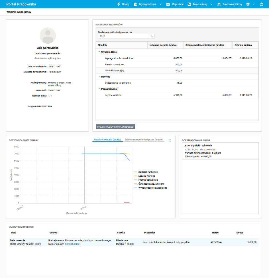Został utworzony dashboard Warunki współpracy, umożliwiający pracownikowi analizę jego warunków zatrudnienia, zmian wynagrodzenia oraz informacji o kursach i szkoleniach finansowanych (lub współfinansowanych) przez pracodawcę, w których bierze udział. Informacje te obejmują rodzaj kursu, czas trwania, organizatora, wartość dofinansowania oraz okres trwania umowy dotyczącej podnoszenia kwalifikacji zawodowych.
