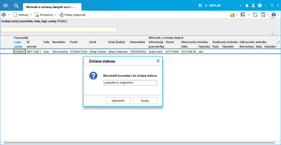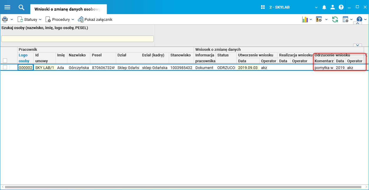 Dodatkowo w słowniku Wnioski o zmianę danych osobowych dostępne są nowe kolumny dotyczące odrzucenia: Komentarz, Data, Operator.