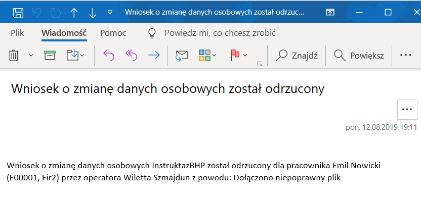 Rys. Powiadomienie mailowe o odrzuceniu wniosku o danych osobowych