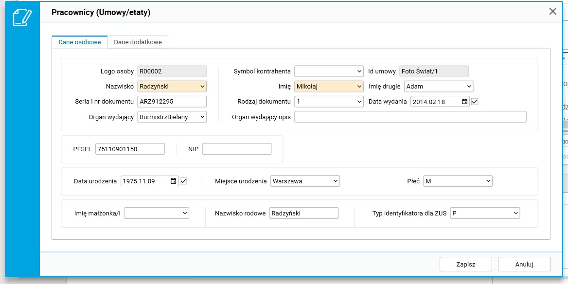 W szczególe Rodzina w słowniku Pracownicy – umowy(etaty) zostały ukryte pola Imię matki oraz Imię ojca.