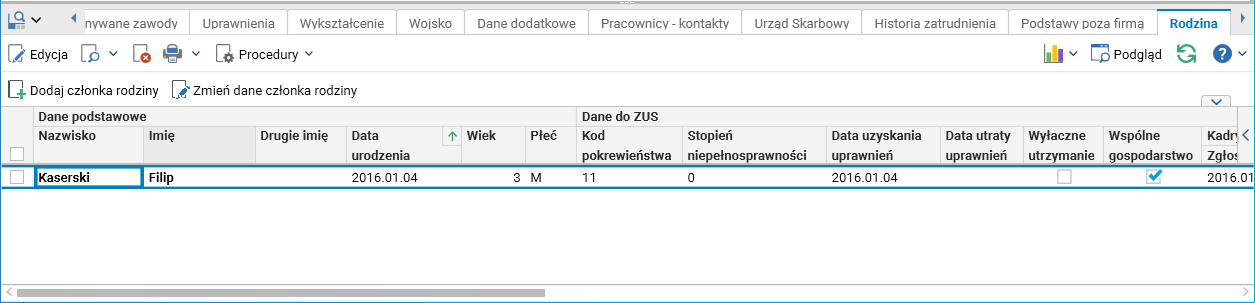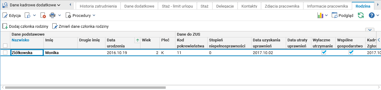 Rys. Szczegół Rodzina w słowniku Pracownicy – umowy(etaty)