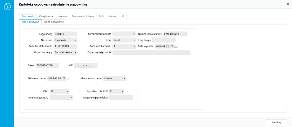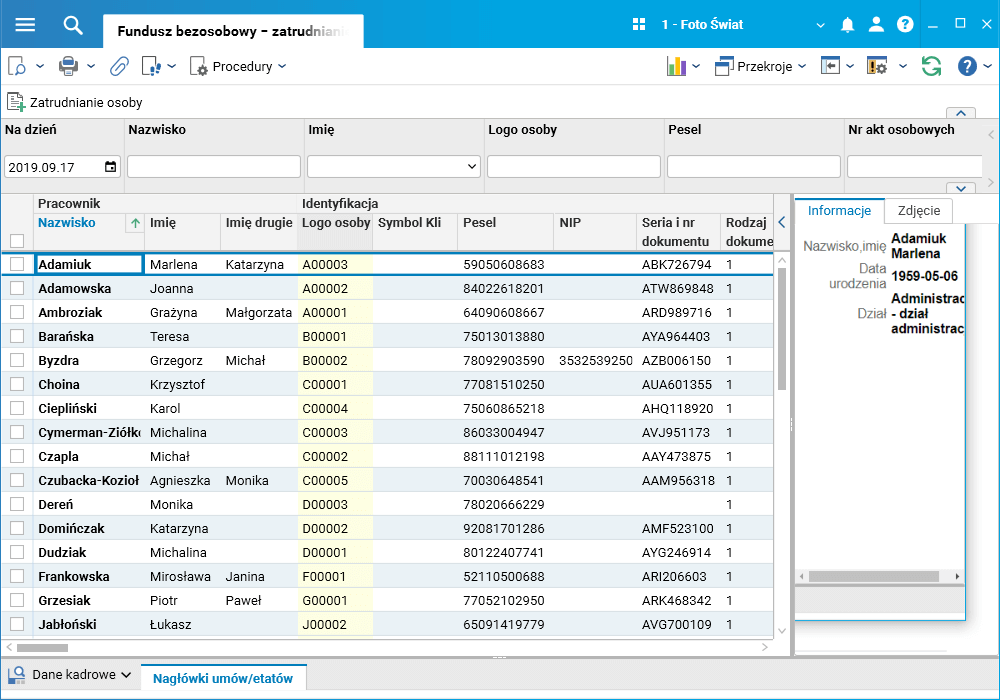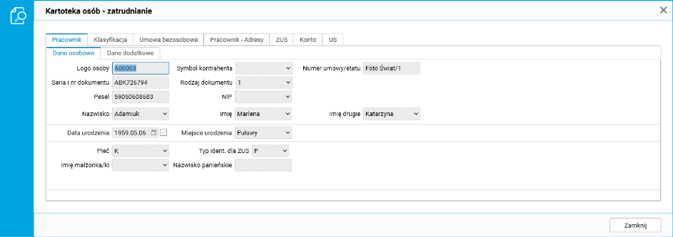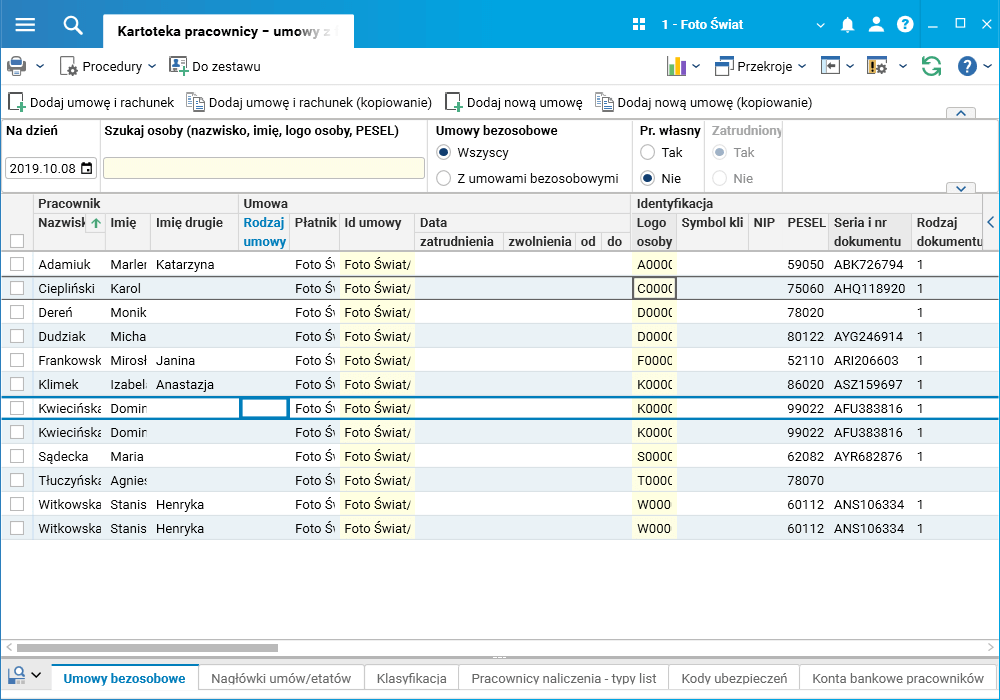 · słownik Kartoteka pracownicy – umowy z funduszu bezosobowego.