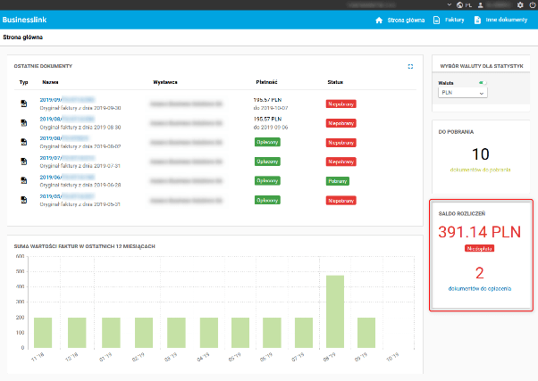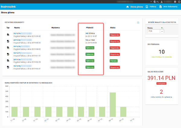 Sekcja Ostatnie dokumenty na kokpicie głównym portalu zawiera listę ostatnio dodanych dokumentów. W kolumnie Płatność dla dokumentów sprzedaży prezentowana jest wartość nierozliczona faktury, jeśli faktura nie jest w pełni uregulowana. Dla dokumentów w pełni opłaconych lub nadpłaconych zamiast kwoty pokaże się status uregulowanej płatności w postaci zielonej etykiety Opłacony. Dla płatności z ustalonym terminem pod kwotą wyświetlany jest termin płatności.