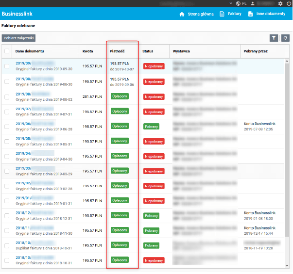 Rys. Prezentacja płatności na liście ostatnich dokumentów