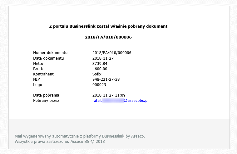 Po pobraniu dokumentu przez odbiorcę na wskazany adres e-mail przyjdzie wiadomość o przykładowej treści pokazanej poniżej: