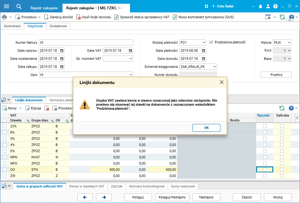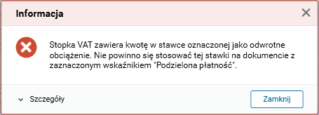 Rys. Ostrzeżenie o nieprawidłowości – jednocześnie ustawiony wskaźnik Podzielona płatność i linijka ze stawką OO (odwrotne obciążenie)