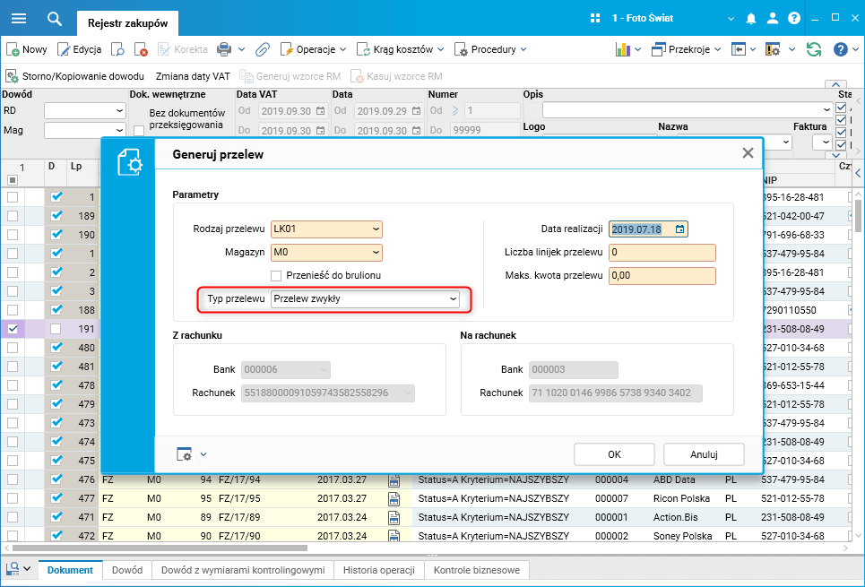 W procedurach do generowania przelewów jednym z parametrów jest Typ przelewu, określający typ przelewu.
