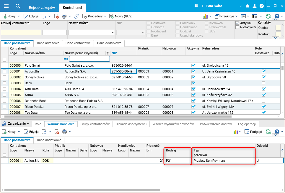Rys. Typ przelewu przypisany do kontrahenta w słowniku Warunki handlowe