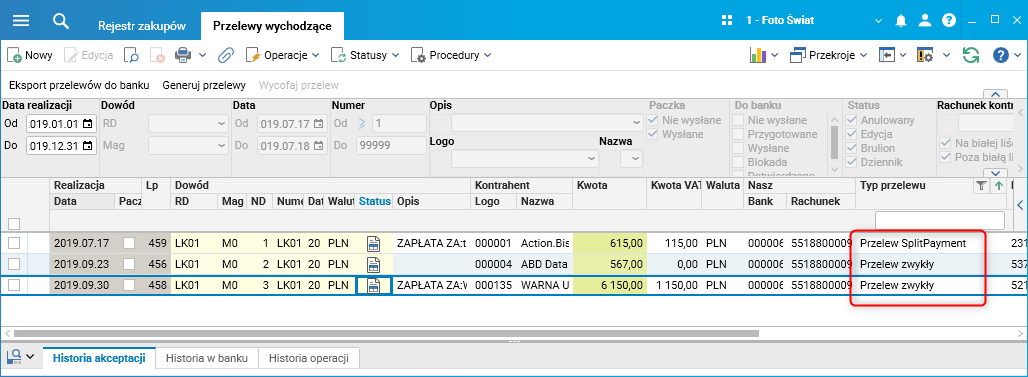 1. Biała lista – kolumna informuje, czy rachunek bankowy jest na białej liście,