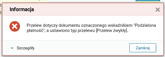Rys. Blokada przeniesienia do brulionu nieprawidłowego dokumentu zakupowego z ustawionym wskaźnikiem Podzielona płatność