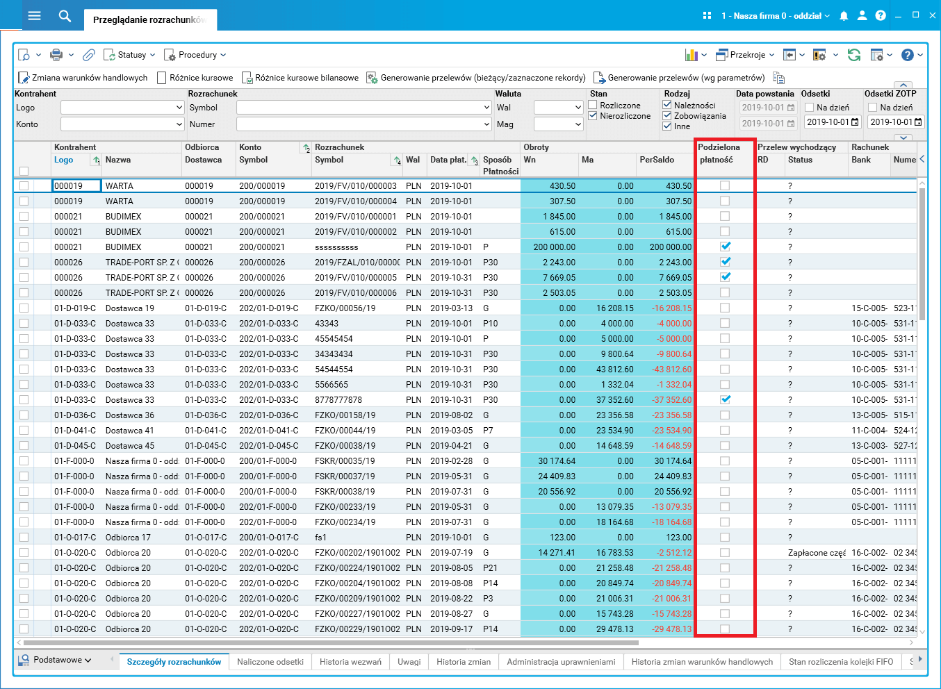 Kolumna Podzielona płatność wskazuje, czy faktura, na podstawie której powstał rozrachunek, jest oznaczona mechanizmem podzielonej płatności. Dodano ją do przekrojów: