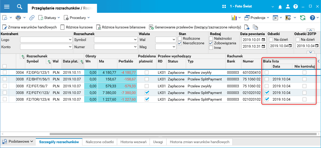 3. Biała lista;Nie kontroluj – wartość wskaźnika Nie kontroluj. Wskaźnik można ręcznie ustawić na rozrachunku, ustawiony oznacza, że nie będzie kontroli, czy rachunek znajduje się na białej liście.