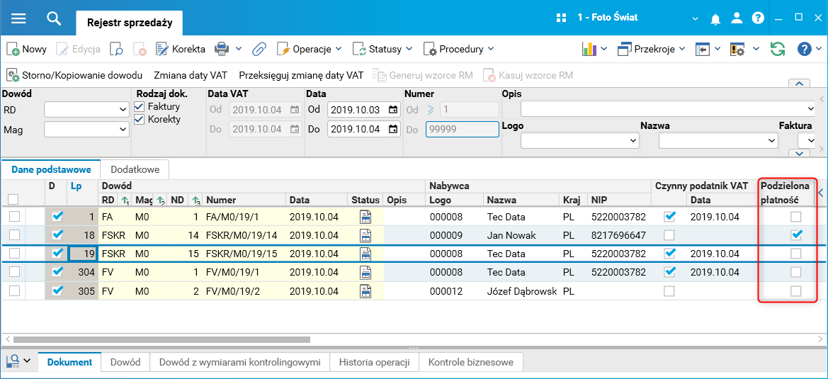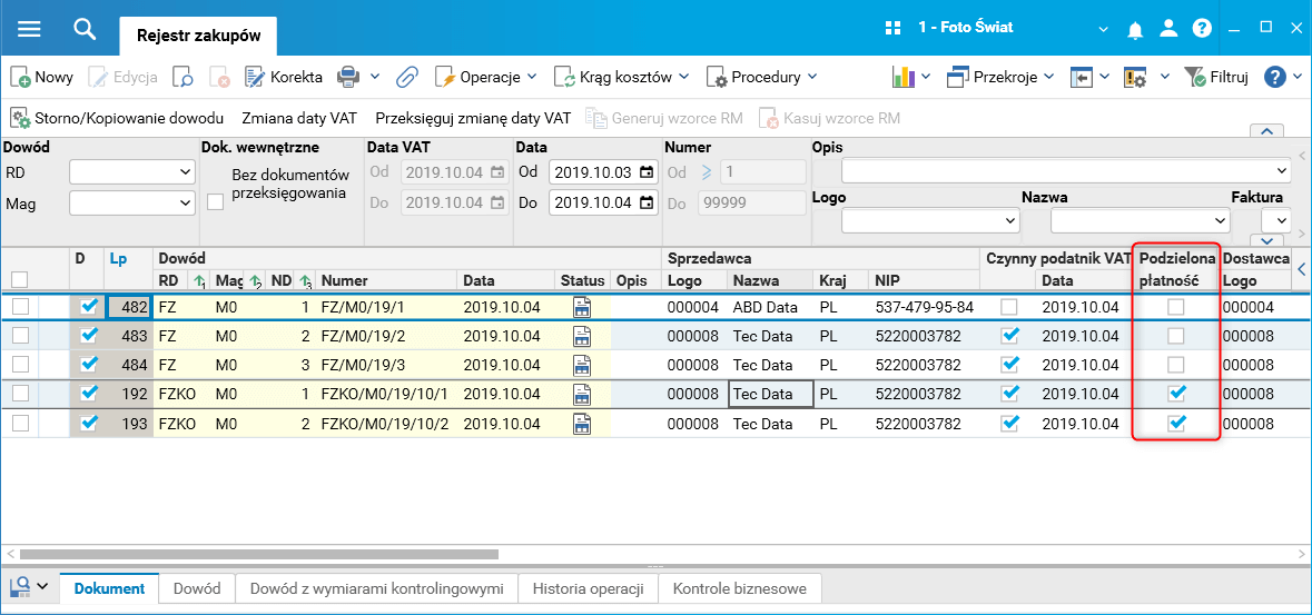 W słownikach Rejestr zakupów i Rejestr sprzedaży dodano kolumnę Podzielona płatność, która wskazuje, czy faktura, na podstawie której powstał rozrachunek, jest oznaczona mechanizmem podzielonej płatności.