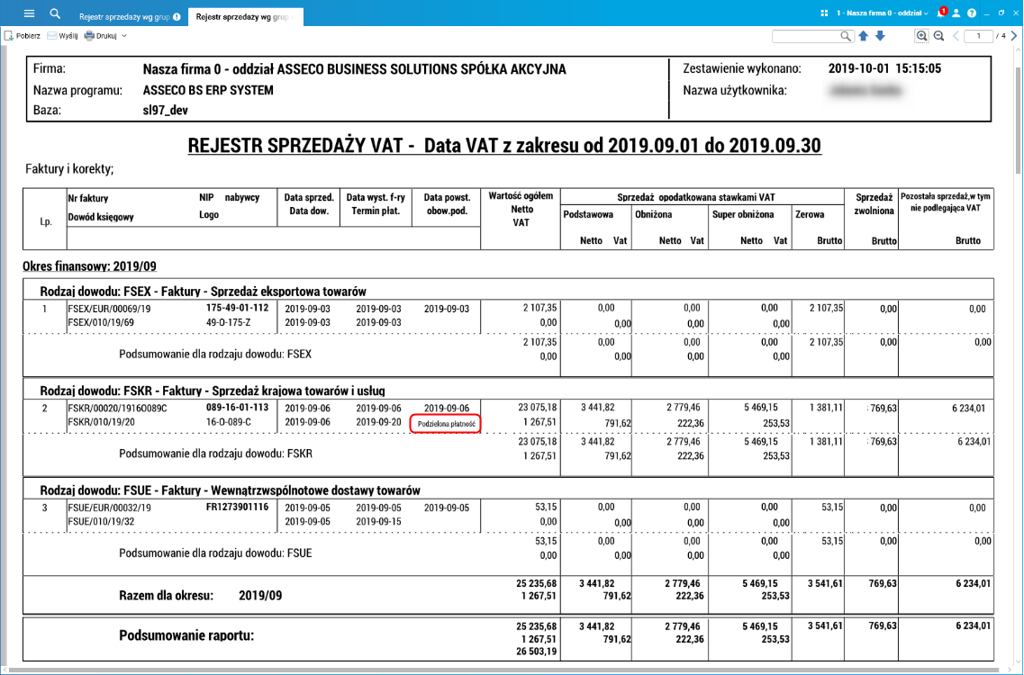 Wydruki rejestrów sprzedaży i zakupów VAT zmodyfikowano tak, aby prezentowały informacje o podzielonej płatności. Jeśli dokument jest oznaczony wskaźnikiem Podzielona płatność, to informacja ta jest drukowana pod datą obowiązku podatkowego. Zmianie uległ również wygląd strony i jest ona teraz bardziej przejrzysta.