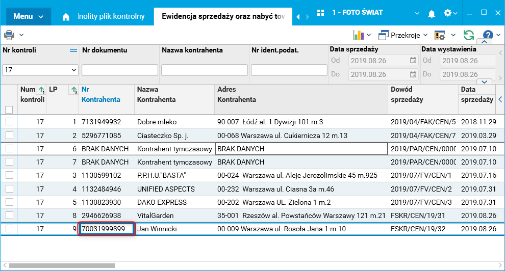 Poniżej prezentujemy przykład wypełnienia pola Nr Kontrahenta w słowniku Ewidencja sprzedaży oraz nabyć towarów i usług – wersja 2 i 3 w przypadku nieustawionego parametru jpk_VATS_pusty_PESEL.
