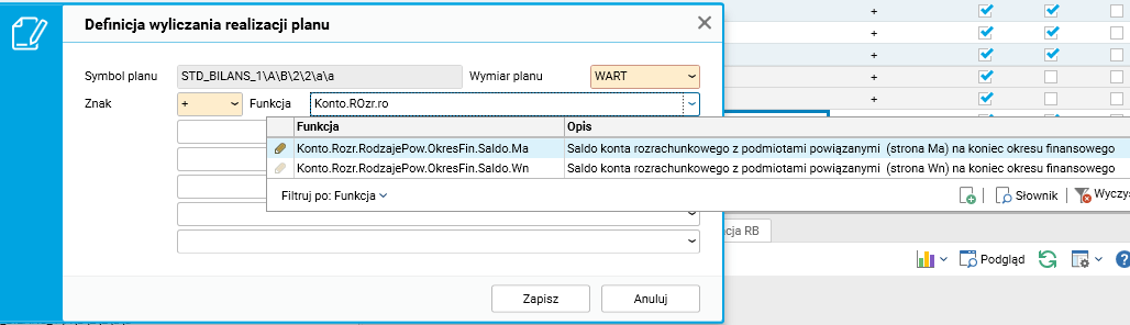 Rys. Możliwość wyboru nowych funkcji podczas definicji wyliczania pozycji sprawozdania
