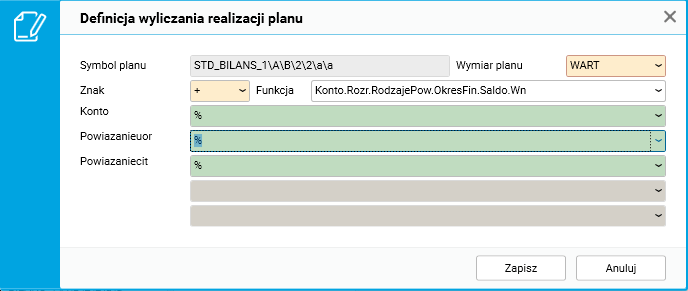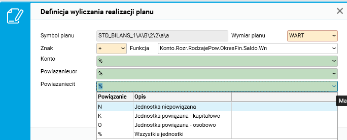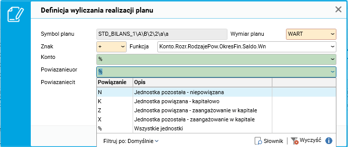 Parametr Powiązanie według UoR to maska na rodzaj powiązania wynikającego z ustawy o rachunkowości. Można ją zbudować z wartości N, K, Z, X oraz %.