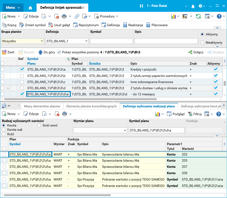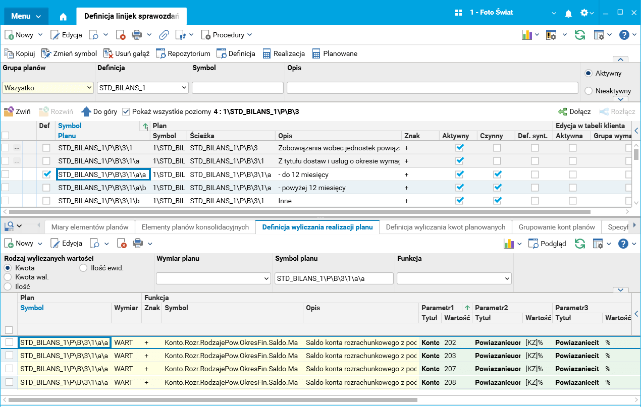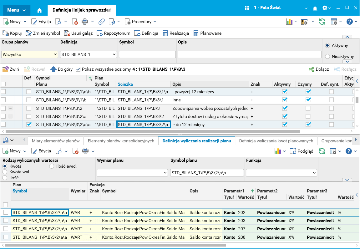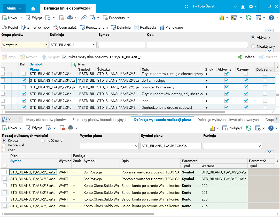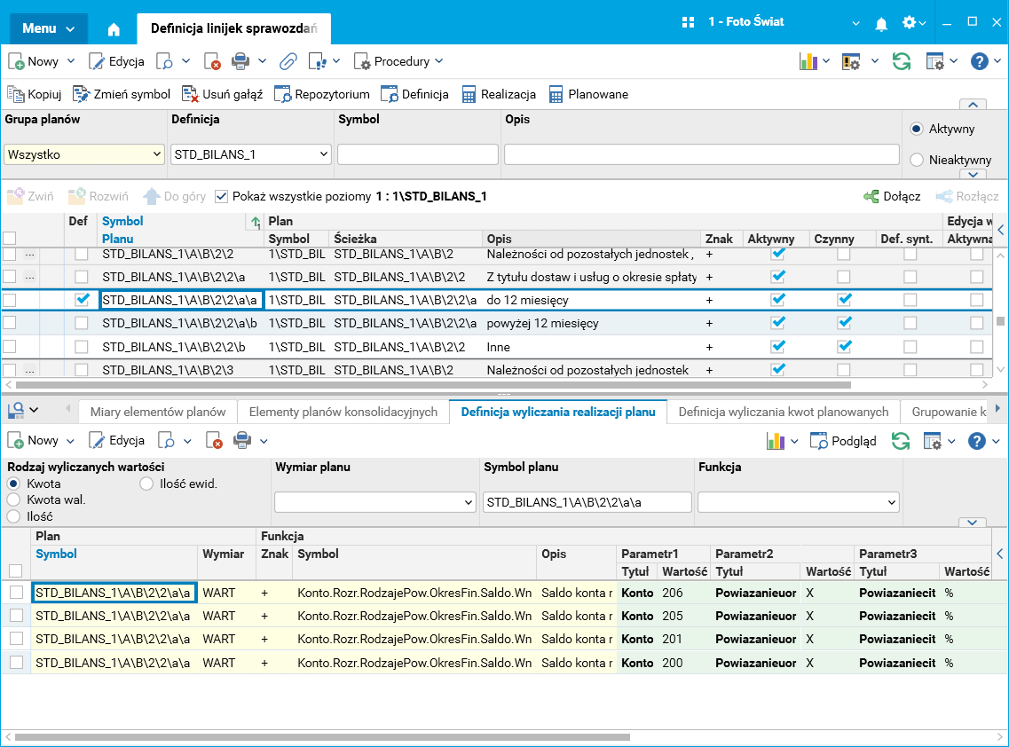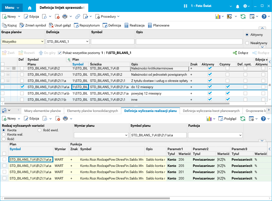 Wykorzystując nowe funkcje, zmodyfikowano definicje wyliczania dla pozycji bilansu (sprawozdanie o symbolu STD_ BILANS_1) dla pozycji należności i zobowiązań krótkoterminowych.