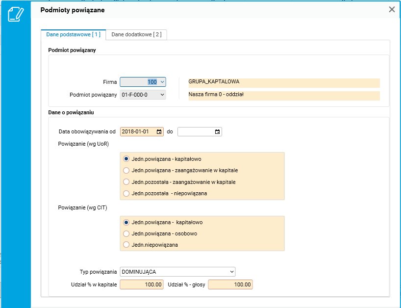 Informacje te znajdują się w słowniku Firmy w szczególe Podmioty powiązane w edycji wiersza, w sekcji Dane o powiązaniu.