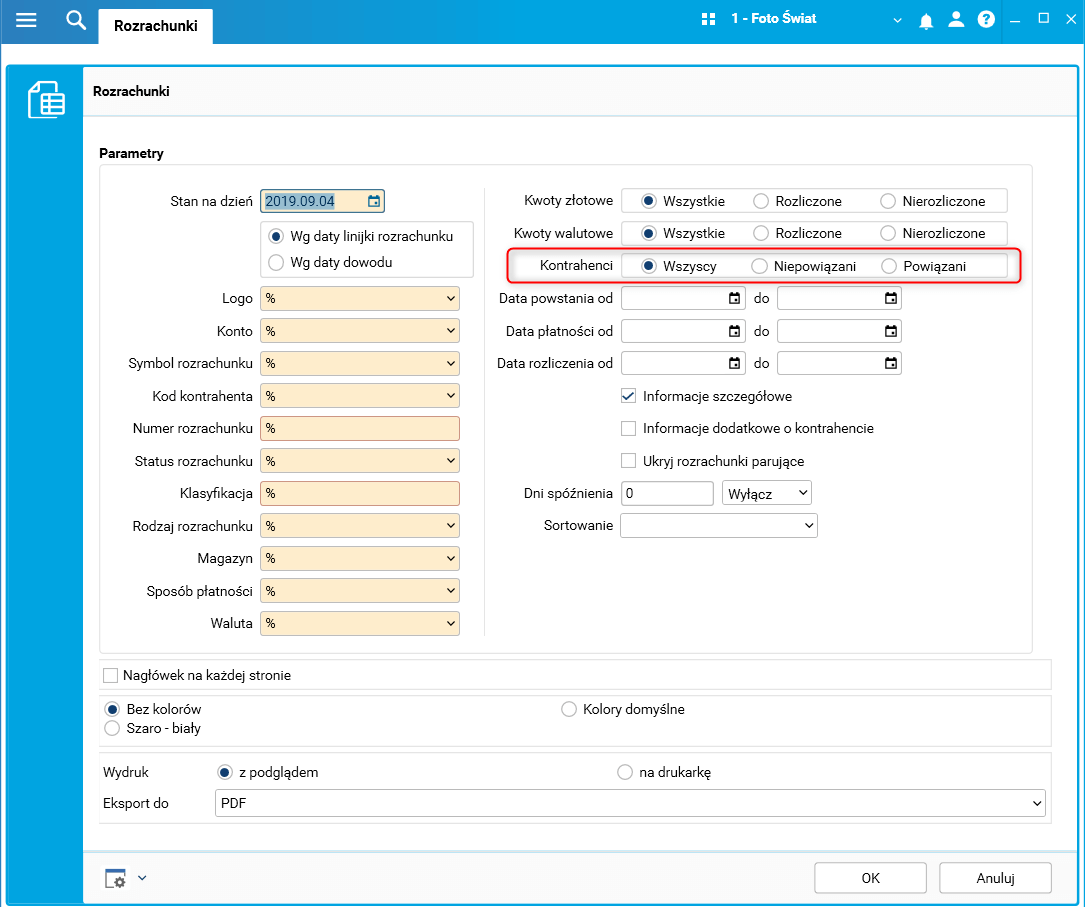 Każdy z tych wydruków w swoich parametrach ma możliwość zawężenia zbioru kontrahentów do powiązanych lub niepowiązanych.