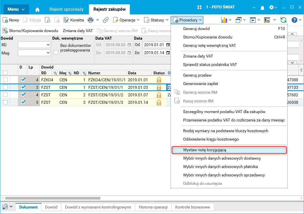Uporządkowanie widoczności procedury do wystawiania not korygujących w rejestrach ZAK, SPRZ, WNT, WDT, ZAKI i SAD