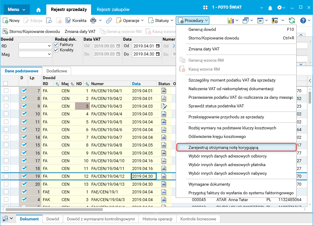 Wprowadzona zmiana sprawia, że we wszystkich rejestrach VAT procedura do wystawienia noty korygującej – czy to otrzymanej (rejestry SPRZ, WDT, SAD), czy wystawionej (rejestry ZAK, WNT, ZAKI, SAD) – jest dostępna zarówno dla dokumentów w statusie Brulion, jak i tych w statusie Dziennik.