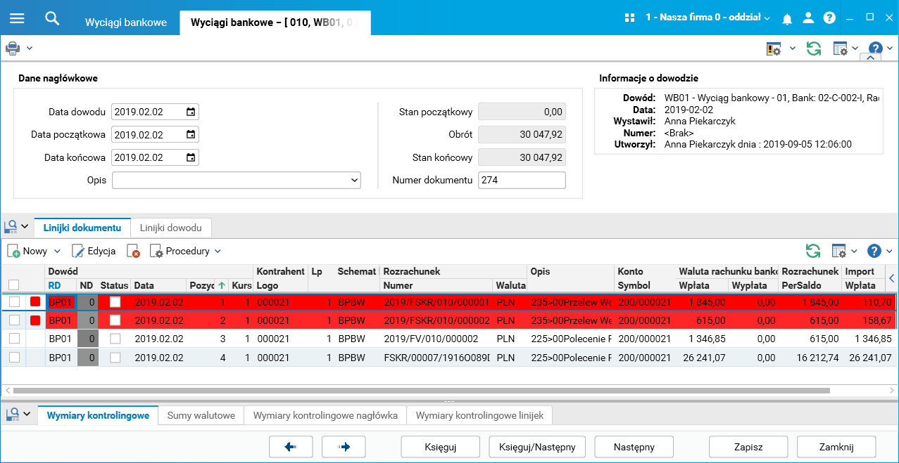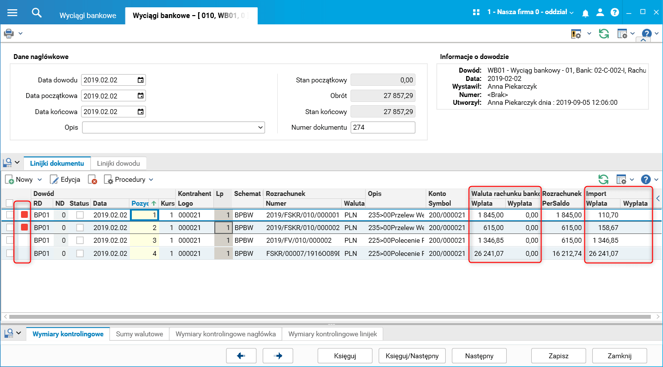 Na zaimportowanych linijkach wyciągu bankowego zostały zwizualizowane wyniki sprawdzenia, czy kwota na linijce jest zgodna z kwotą wczytaną z pliku.