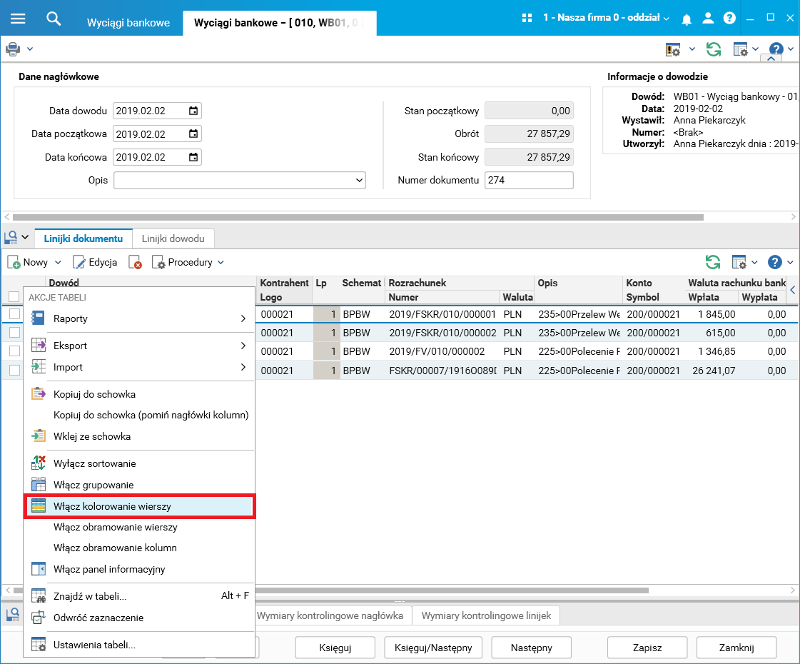 Rys. Zmodyfikowane pozycje wyciągu bankowego z włączoną opcją kolorowania wierszy