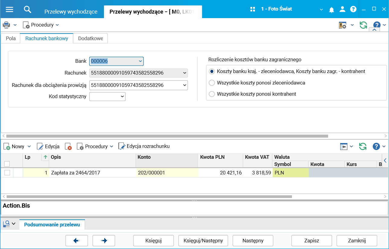 Podczas tworzenia przelewu system wymaga podania rodzaju dowodu i magazynu. Pola te jednoznacznie wskazują rachunek bankowy do obciążenia i na tej podstawie inicjowane są pola Bank i Rachunek na przelewie. We wcześniejszych wersjach systemu operator mógł zmieniać te pola podczas edycji przelewu, aby wskazać np. inny rachunek z wystarczającą ilością środków do realizacji płatności. Obecnie w systemie pola te są domyślnie zablokowane, ale na żądanie istnieje możliwość przywrócenia ich edycji.