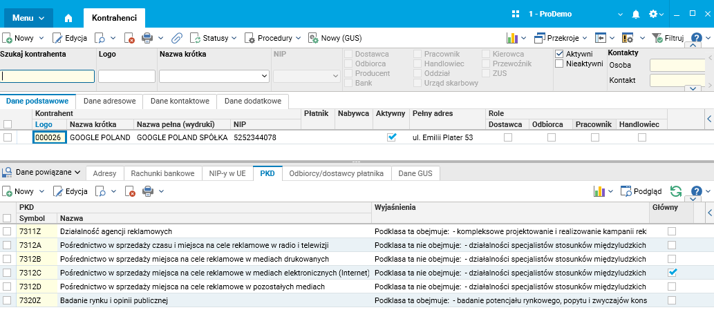 Obecnie podczas dodawania nowego kontrahenta za pomocą akcji Nowy (GUS) importowane są jego dane poszerzone o klasyfikację PKD. Dodatkowo w słownikach Kontrahenci (moduł ERP) oraz Kontrahenci CRM (moduł CRM) dodano procedurę Pobierz PKD z GUS, która umożliwia pobranie z GUS danych PKD dla kontrahentów utworzonych ręcznie.