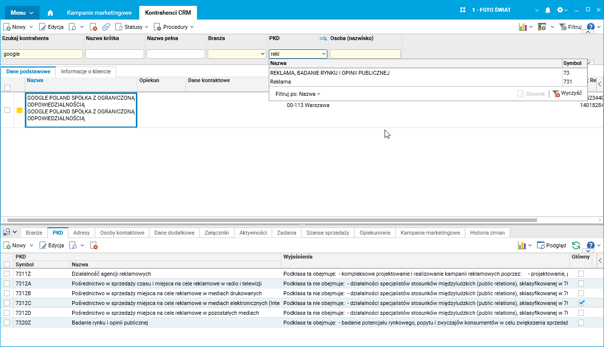 Dodatkowo w słowniku Kontrahenci CRM dodano filtr PKD, który umożliwia wyszukiwanie kontrahentów wg danych o rodzaju prowadzonej działalności.